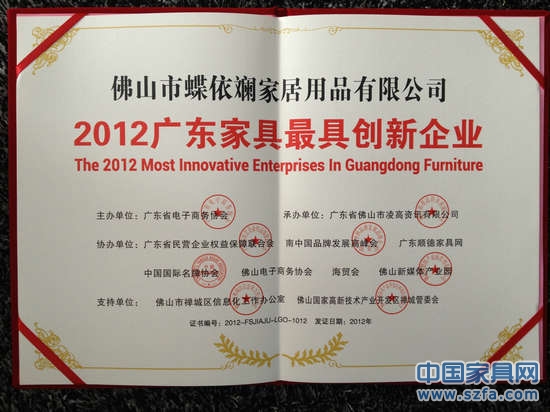 2012年12月28日,由廣東省電子商務(wù)協(xié)會(huì)舉辦的,廣東家具行業(yè)創(chuàng)新頒獎(jiǎng)典禮在佛山舉行。數(shù)百家業(yè)內(nèi)代表企業(yè)精英齊聚,共襄盛舉。佛山市蝶依斕家居用品有限公司榮獲2012廣東家具最具創(chuàng)新企業(yè)殊榮。