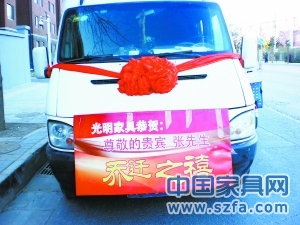 送貨車(chē)上掛大紅花和“喬遷之喜”的牌匾,給足客戶(hù)面子