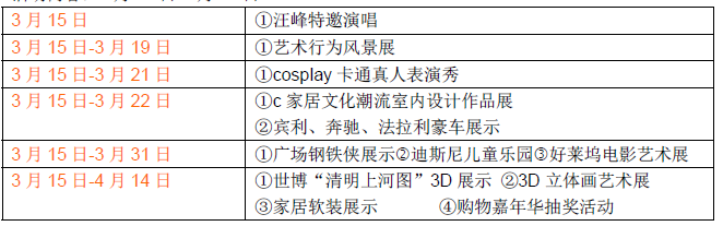 3月15日汪峰特邀演唱;3月15日-3月19日藝術(shù)行為風景展;3月15日-3月21日cosplay卡通真人表演秀;3月15日-3月22日家居文化潮流室內(nèi)設(shè)計作品展、賓利、奔馳、法拉利豪車展示;3月15日-3月31日廣場鋼鐵俠展示迪斯尼兒童樂園好萊塢電影藝術(shù)展;3月15日-4月14日世博“清明上河圖”3D展示、3D立體畫藝術(shù)展、家居軟裝展示、購物嘉年華抽獎活動。