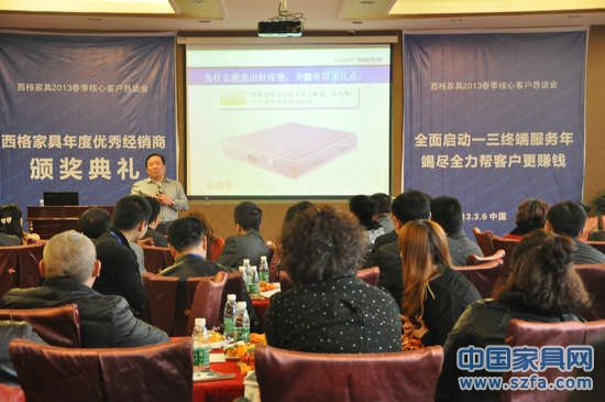 2013年3月6日,成都市帝錦大酒店,西格家具順利召開了2013年春季核心客戶懇談會暨年度優(yōu)秀經銷商頒獎典禮。會議以“全面啟動一三終端服務年,竭盡全力幫客戶更賺錢”為主題,西格家具董事長鐘治平從五大要素入手,為經銷商講解了西格家具終端盈利模式系統(tǒng),為促進銷售業(yè)的倍增打牢基礎。