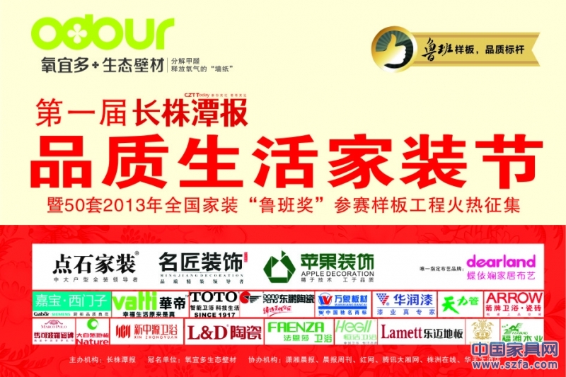 由中國(guó)建筑裝飾協(xié)會(huì)主辦的每年一度的行業(yè)評(píng)選,全國(guó)住宅裝飾裝修行業(yè)示范工程獎(jiǎng)已成為裝飾裝修行業(yè)在家裝工程質(zhì)量范疇內(nèi)的最高榮譽(yù),被譽(yù)為家裝“魯班獎(jiǎng)”。 2013年4月1日,《長(zhǎng)株潭報(bào)》以品質(zhì)生活家裝節(jié)的名義,面向株洲征集50套全國(guó)家裝“魯班獎(jiǎng)”參賽樣板工程,精選蘋(píng)果裝飾、名匠裝飾、點(diǎn)石家裝3家頂級(jí)家裝公司,唯一指定布藝品牌蝶依斕家居布藝,這四家裝修、裝飾一線品牌,將以精湛的工藝及高品質(zhì)的服務(wù),為廣大業(yè)主設(shè)計(jì)一個(gè)能拿“魯班獎(jiǎng)的家”。