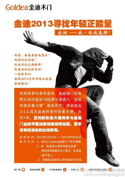 比如這最近正當(dāng)紅的#金迪2013尋找年輕正能量#。http://event.weibo.com/796349輕輕一點(diǎn)照片發(fā)送,隨便@三五好友就能參加的微選秀活動(dòng),再簡單不過。以至于成千上萬的的年輕人參與其中。這次活動(dòng)宣揚(yáng)年輕正能量,宣揚(yáng)自己的青春自己做主。假若你還有激情就應(yīng)該參與其中,與那些擁有正能量的年輕人們一決高下,或是對(duì)酒當(dāng)歌,或是華山論劍。只要你喜歡哪樣都可以。