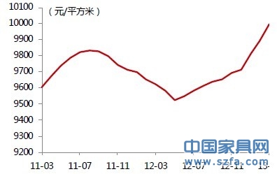 國內(nèi)房地產(chǎn)量價齊升。自去年下半年以來,在剛需購房帶動下,房市回暖跡象明顯,呈現(xiàn)量價齊升現(xiàn)象。截至今年2月,商品房銷售面積累計1.05億平方米,同比增速49.5%。而住宅成交價格在去年6月開始連續(xù)十個月上漲,今年3月全國100個城市住宅平均價格為9998元/平方米,環(huán)比上漲1.06%。