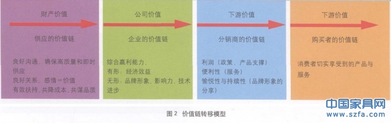 家具企業(yè)不應只考慮自己的價值,還需要考慮產業(yè)鏈上下游的價值。只有如此,自身的發(fā)展才是可持續(xù)的。圖2為價值鏈轉移模型。
