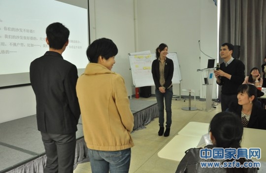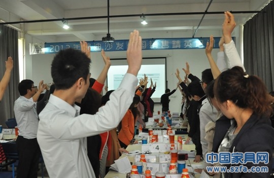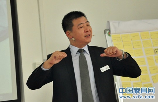 高老師快樂授課,圖為在講解家居顧問的八個流程訓練:迎客、接觸、產(chǎn)品介紹、引導顧客感受產(chǎn)品、開顧客的心門、處理反對意見、成交動作、留客。