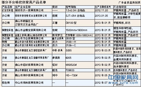 據(jù)廣東省質(zhì)監(jiān)局介紹,本次監(jiān)督檢驗(yàn)涉及廣州、深圳、東莞、汕頭等12個地市(區(qū))203家企業(yè)生產(chǎn)的294批次軟體家具產(chǎn)品,發(fā)現(xiàn)61批次不合格,不合格產(chǎn)品發(fā)現(xiàn)率為20.7%。不合格產(chǎn)品質(zhì)量問題,涉及甲醛釋放量、鋪墊料物理性能、衛(wèi)生、安全等項(xiàng)目。其中深圳市天一家具有限公司生產(chǎn)的紅寶石牌床墊,甲醛釋放量超標(biāo);佛山市銘軒家具有限公司生產(chǎn)的一款銘軒牌辦公椅,底座靜載荷功能性等項(xiàng)目不合格。