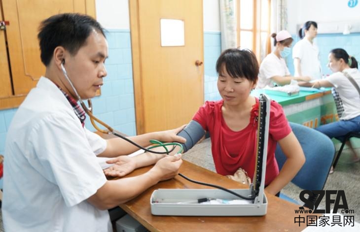 醫(yī)生在為蝶依斕員工作常規(guī)檢查(血壓測(cè)量 抽血化驗(yàn))