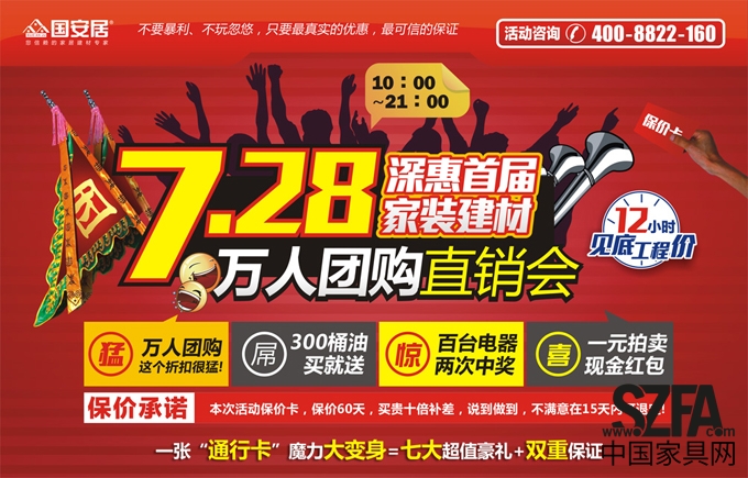 國安居家居建材連鎖商場副總經(jīng)理鄧劍峰說:國安居發(fā)展至今十年一直堅(jiān)持“以人為本,誠信經(jīng)營,”的理念,為再次體現(xiàn)和強(qiáng)調(diào)我們這一理念,本次活動(dòng)當(dāng)天惠陽國安居一樓大廳將特別設(shè)置價(jià)格服務(wù)舉報(bào)臺(tái),對于此次活動(dòng)我們鄭重承諾:保價(jià)60天,買貴十倍補(bǔ)差,15天內(nèi)不滿意可退訂!毋庸置疑,惠陽國安居7月28日萬人團(tuán)購會(huì)上近百款千元品牌建材1元起拍,百余款正品建材產(chǎn)品2折起搶購,讓所有業(yè)主放心購買,將省錢進(jìn)行到底,另外享受強(qiáng)有力的售后服務(wù)保障。國安居航天國企,值得信賴的家居建材專家。