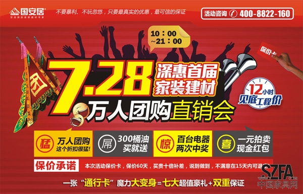 據(jù)各大報(bào)紙和新聞媒體加急報(bào)道:7月28日將是惠陽(yáng)史上最熱的一天,號(hào)稱來(lái)自惠陽(yáng)國(guó)安居名為“首屆深惠家裝建材萬(wàn)人團(tuán)購(gòu)直銷會(huì)”熱流將在惠陽(yáng)人民四路國(guó)安居登陸。這里將聚集深圳、惠州兩地業(yè)主,匯集150余戶國(guó)內(nèi)外一線品牌商家,打造一場(chǎng)史無(wú)前例的年度家裝盛會(huì),折扣低至2折,現(xiàn)場(chǎng)融合吃、玩、購(gòu)物于一體構(gòu)造一個(gè)超大型、火爆的大PARTY。