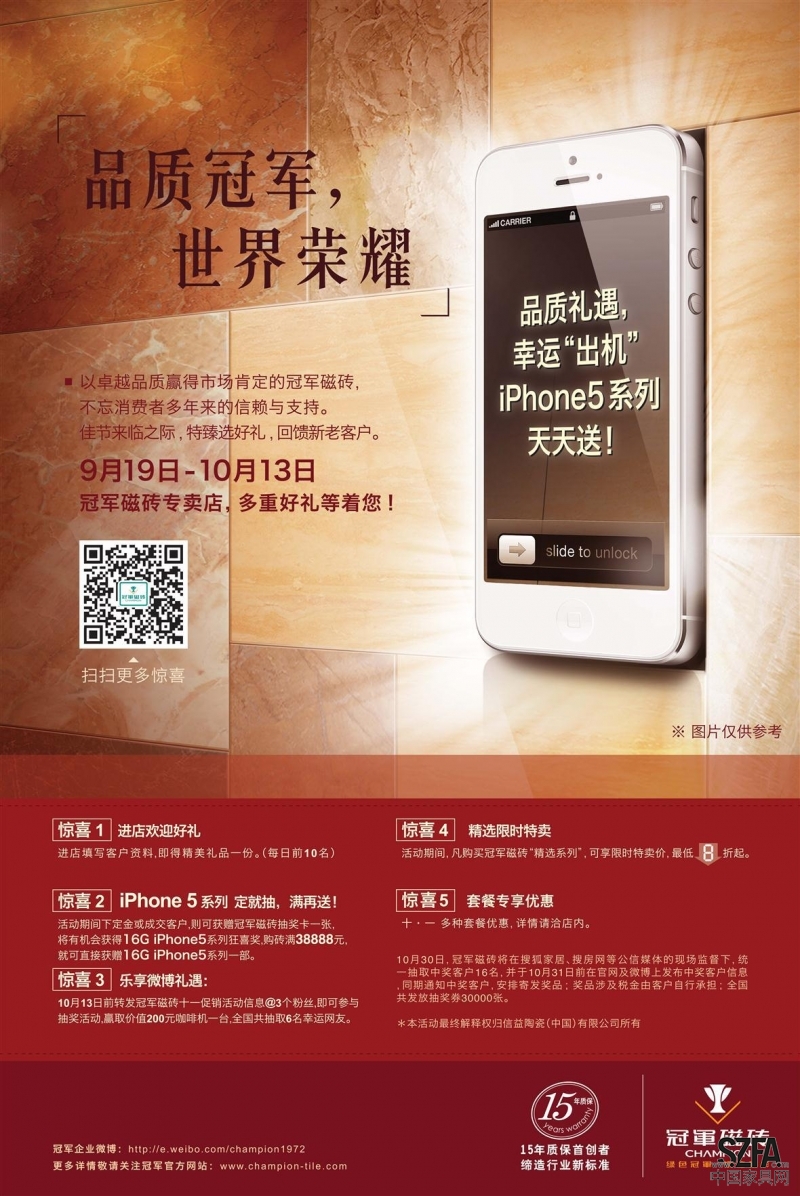 更值得期待的是9月19日-10月13日,冠軍將攜手iPhone5系列共慶佳節(jié),在您把瓷磚帶回家的同時(shí),冠軍還將讓您有機(jī)會(huì)把iPhone5系列手機(jī)大獎(jiǎng)也拿回家,每天一部,驚喜連連。