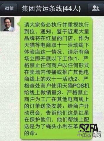 京華時報記者最早看到車建新的微信截圖是在10月27日,并就此與紅星方面進(jìn)行了核實,結(jié)果是未予否認(rèn)。該微信應(yīng)發(fā)自車建新的工作號,主要內(nèi)容是針對大量品牌欲將紅星作為“雙11”天貓線下體驗店的對策——“嚴(yán)禁任何商戶以任何形式在賣場內(nèi)傳播或推廣其他電商線上的‘雙11’活動;嚴(yán)格查處商戶使用天貓POS機給線上做銷量;嚴(yán)格禁止商戶為工廠在其他電商線上的訂單送貨安裝。”車建新要求全國賣場統(tǒng)一徹查。
