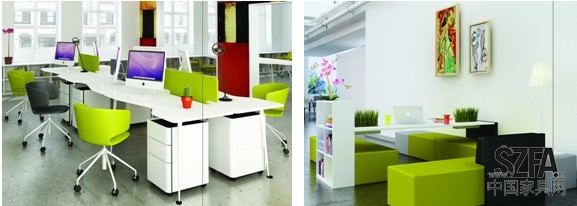 這款辦公家具的設(shè)計(jì)造型已經(jīng)申請(qǐng)專利,桌沿以流水線條的形式引導(dǎo)使用者側(cè)身而坐,使并排而坐的工作者之間也能擁有相對(duì)私密性。沒有采用傳統(tǒng)的落地屏風(fēng)作為間隔,只是在桌面上以輕快的果綠色亞克力材料或綠色植物稍作隔板,營造開放、活潑、高效溝通的辦公氛圍。同款樂樂休閑沙發(fā)套件由多個(gè)單件組合而成,可根據(jù)整體空間的尺寸、個(gè)人喜好、功能需求等對(duì)模塊進(jìn)行移動(dòng)組合,多變的造型能適應(yīng)多種場合需求。