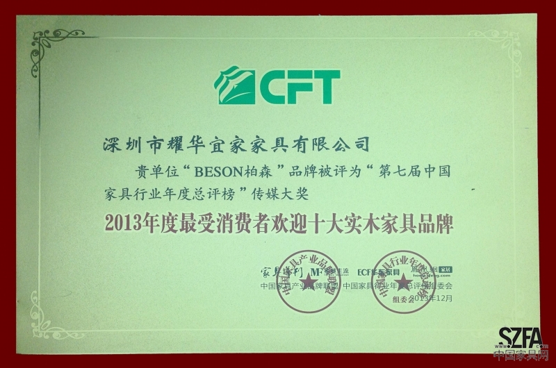 柏森家具在2013年度優(yōu)秀的表現(xiàn)和對中國家具的杰出貢獻(xiàn),榮獲了“2013年度最受消費者歡迎十大家具品牌”、“2013中國家具行業(yè)年度最佳原創(chuàng)品牌”、公司董事兼執(zhí)行總裁陳安南榮獲“2013中國家具行業(yè)年度十大企業(yè)家”稱號,品牌總監(jiān)張運金榮獲“2013中國家具行業(yè)年度杰出職業(yè)經(jīng)理人”稱號,斬獲四項大獎,是此次獲獎最多的企業(yè)之一。
