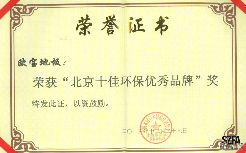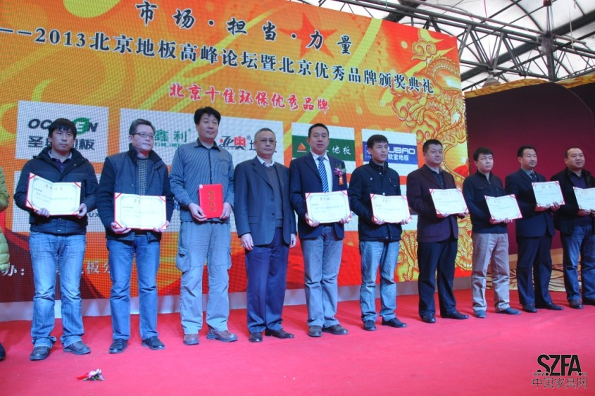 在剛剛過(guò)去的2013年末,歐寶地板在2013北京地板高峰論壇暨北京優(yōu)秀品牌頒獎(jiǎng)典禮上榮獲北京十佳環(huán)保優(yōu)秀品牌獎(jiǎng)。這次同臺(tái)領(lǐng)獎(jiǎng)的企業(yè)有圣象、歐寶、生活家、安信及大自然等等企業(yè),紅星美凱龍、集美等家居商場(chǎng)負(fù)責(zé)人及媒體記者300余人參加此次盛會(huì)。