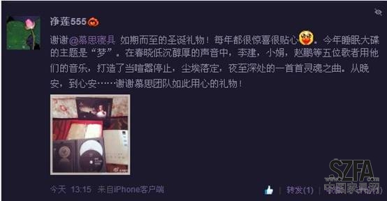 小編發(fā)現(xiàn),網(wǎng)友們所曬的睡眠音樂(lè)碟是一張叫做《夢(mèng)》的黑膠碟片,隨著這張黑膠唱片出現(xiàn)的還有一本叫做《深睡眠》的書(shū)籍等物品。深入調(diào)查之后小編發(fā)現(xiàn),原來(lái)這是一家叫做慕思的寢具公司送給老客戶(hù)的圣誕禮品,因?yàn)檫@家成立十年的公司已經(jīng)持續(xù)送給客戶(hù)禮品超過(guò)十年,因此收到禮物的客戶(hù)都很感動(dòng),紛紛曬出禮品表示感謝!有粉絲發(fā)微信表示:“十年時(shí)間,橫跨了整整一個(gè)年代,在現(xiàn)在這個(gè)浮躁的社會(huì),慕思寢具能堅(jiān)持十年如一日的感動(dòng)我,我想對(duì)你說(shuō):你是我心中最喜愛(ài)的品牌,沒(méi)有之一。”
