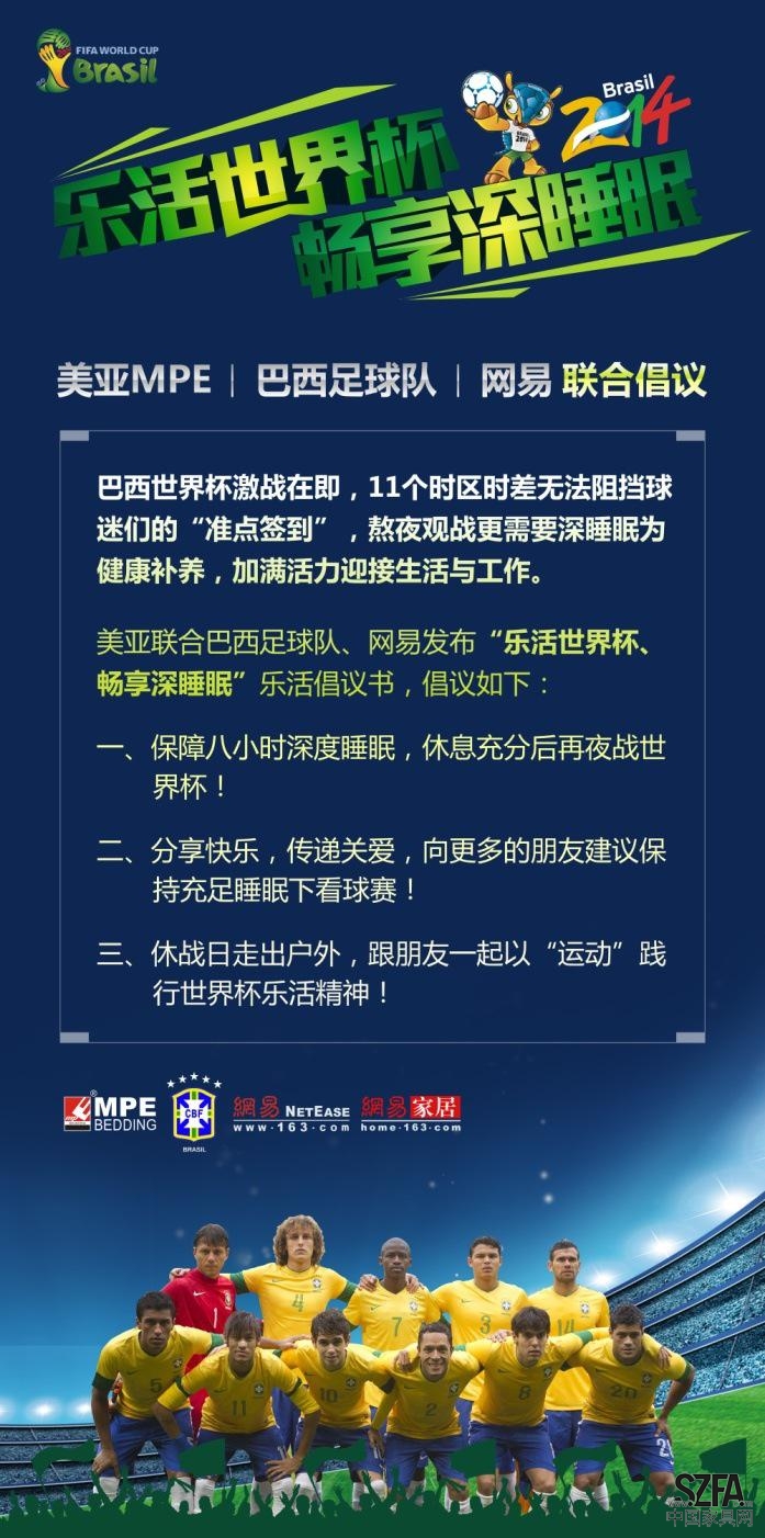 巴西世界杯進入開幕倒計時階段。近日,美亞MPE聯(lián)合巴西足球隊、網(wǎng)易發(fā)起了“樂活世界杯 暢享深睡眠”公益倡議書,旨在倡導廣大中國球迷朋友在享受世界杯精彩球賽的同時,也要保證睡眠質(zhì)量跟得上。倡議書具體內(nèi)容如下: