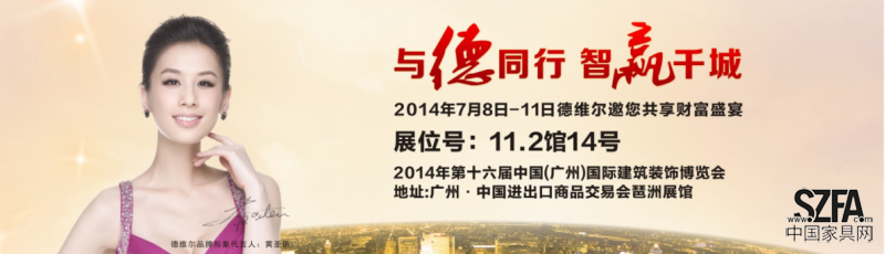 流火七月,建材盛典,第十六屆中國(guó)(廣州)國(guó)際建筑裝飾博覽會(huì)(以下簡(jiǎn)稱“廣州建博會(huì)”)將于2014年7月8日-11日在中國(guó)進(jìn)出口商品交易會(huì)琶洲展館隆重開幕! 眾多行業(yè)“明星”企業(yè)將齊聚一堂。屆時(shí),作為“中國(guó)整體衣柜十大品牌”的德維爾衣柜將攜黃圣依強(qiáng)勢(shì)登陸本屆建博會(huì),B區(qū)11.2館14號(hào)展位,德維爾屆時(shí)將為全球客戶帶來(lái)全新研發(fā)的集成家居系列新品,涵括整體衣柜、趟門、臥室、書房、衣帽間、客廳等。尤其是德維爾充滿創(chuàng)意的展館造型,以終端店面形象為展館外觀形象,高貴雅致的色彩裝修,帶來(lái)全新的視覺享受,完美詮釋“愛的感覺·家的選擇”的品牌理念,匯集天時(shí)地利人和,將助力德維爾在本屆建博會(huì)上大放異彩!