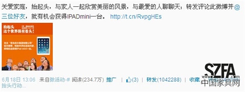 為了能讓更多的人參與到“抬頭行動(dòng)”中來,青島良木家具專門在人數(shù)最多的新浪微博發(fā)起此項(xiàng)活動(dòng),截止到目前為止,活動(dòng)閱讀量達(dá)到了234萬人次,實(shí)際轉(zhuǎn)發(fā)量更是達(dá)到了104萬人次。
