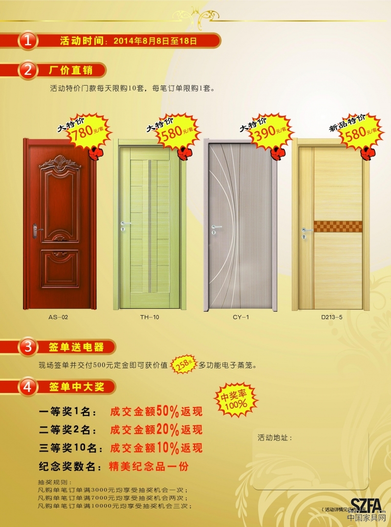 驚喜三、買門中大獎(jiǎng):凡滿足要求的客戶都可以免費(fèi)抽獎(jiǎng),中獎(jiǎng)率100%,最高現(xiàn)金獎(jiǎng)可達(dá)貨款全額的50%!