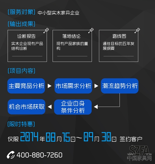 8月15日起,深圳家具研究開發(fā)院將啟動(dòng)《中小企業(yè)戰(zhàn)略扶持•特別計(jì)劃》(以下簡稱扶持計(jì)劃)。這是深圳研究開發(fā)院首次推出該項(xiàng)計(jì)劃,扶持計(jì)劃將以優(yōu)惠的價(jià)格為中小實(shí)木企業(yè)提供定制專題項(xiàng)目——《產(chǎn)品走向、終端、定位與導(dǎo)向研究》。