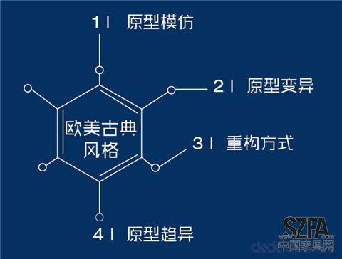 在上一篇文章中,我們給出了歐美古典風格家具現(xiàn)代延展設(shè)計的四種方法,即:原型模仿、原型變異、重構(gòu)方式和原型趨異。