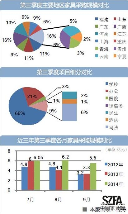 告別上半年家具政府采購(gòu)市場(chǎng)的低迷期后,第三季度,家具政府采購(gòu)重振雄風(fēng),并以17.75億元的采購(gòu)總金額完美收官。據(jù)《政府采購(gòu)信息報(bào)》不完全統(tǒng)計(jì),第三季度單月采購(gòu)金額較前兩年均有明顯提高,采購(gòu)總金額同比2013年的13.4億元增長(zhǎng)了32.5%,環(huán)比第二季度的11.01億元增長(zhǎng)了61.2%。
