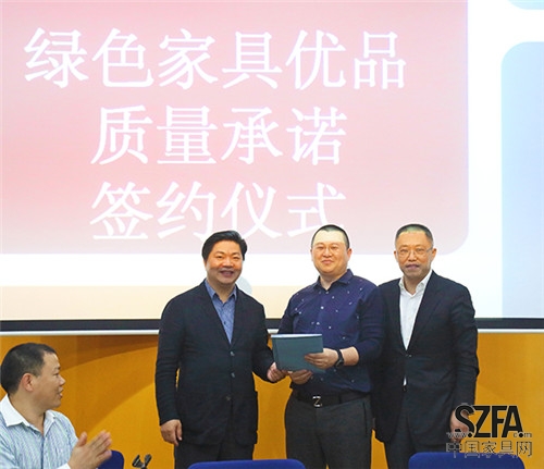 在后續(xù)的簽約見證環(huán)節(jié)中,四家入選企業(yè)代表——左右家私李真東、雅蘭集團譚中兵、森堡家私李友忠及新福牌家具陳燦陽將簽約文件交予深圳市家具行業(yè)協(xié)會會長黃華坤手中,并分別就本次簽約的意義進行了發(fā)言。他們認為,這不僅是一場儀式,更代表著對消費者、行業(yè)、社會的承諾和責任。最后,為了讓在座供應商對“綠色家具優(yōu)品”有更深的了解,深圳賽德檢測中心主任王麗對優(yōu)品評定項目也進行了詳細的介紹。