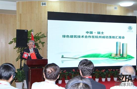 位于杭州高新區(qū)的“亞科中心”(全稱“杭州生物醫(yī)藥科技創(chuàng)業(yè)基地”)工程由瑞士專家主持設(shè)計(jì),中方施工,2013年獲國(guó)家三星級(jí)“綠色建筑設(shè)計(jì)標(biāo)識(shí)”,竣工后使用中,全面地體現(xiàn)布魯諾•凱樂先生的“健康、舒適、節(jié)能”的設(shè)計(jì)理念,特別在室外PM2.5達(dá)到200以上時(shí),室內(nèi)能保持在20左右(空氣優(yōu)質(zhì)標(biāo)準(zhǔn))。本次匯報(bào)會(huì),通過杭州亞科的實(shí)例交流活動(dòng),推動(dòng)了中國(guó)與瑞士雙方在此領(lǐng)域的國(guó)際性交流、學(xué)術(shù)、科研及其他合作,同時(shí)也向社會(huì)大眾人士講述了建筑物綠色技術(shù)與室內(nèi)空氣質(zhì)量營(yíng)造之間的關(guān)系。
