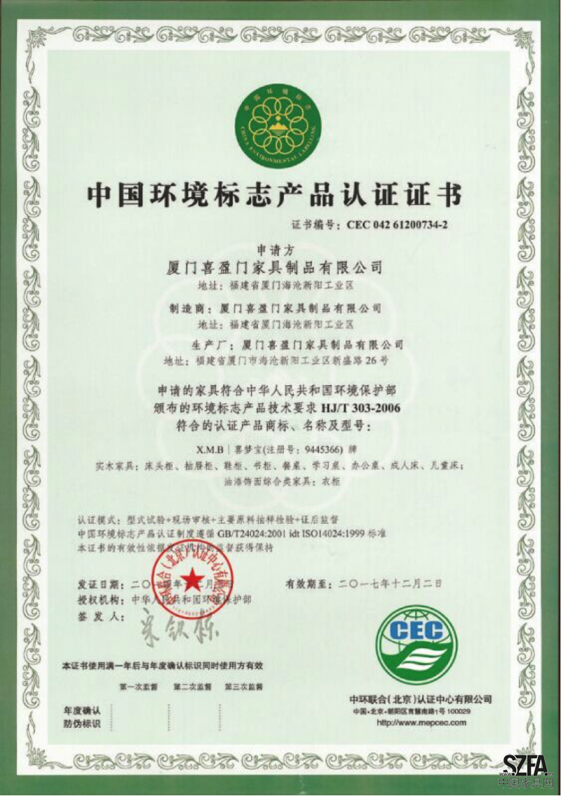 喜夢(mèng)寶在通過中國(guó)最權(quán)威的環(huán)保監(jiān)測(cè)后,于2015年初正式獲得“十環(huán)認(rèn)證”,即中國(guó)環(huán)境標(biāo)志產(chǎn)品認(rèn)證,它是依據(jù)中國(guó)最高環(huán)保標(biāo)準(zhǔn)、最權(quán)威的綠色環(huán)保產(chǎn)品認(rèn)證。這個(gè)標(biāo)志是由國(guó)家環(huán)??偩质跈?quán)的綠色認(rèn)證,也是我國(guó)唯一由政府頒布的最高權(quán)威環(huán)保產(chǎn)品標(biāo)志。