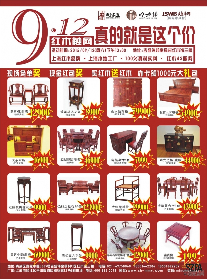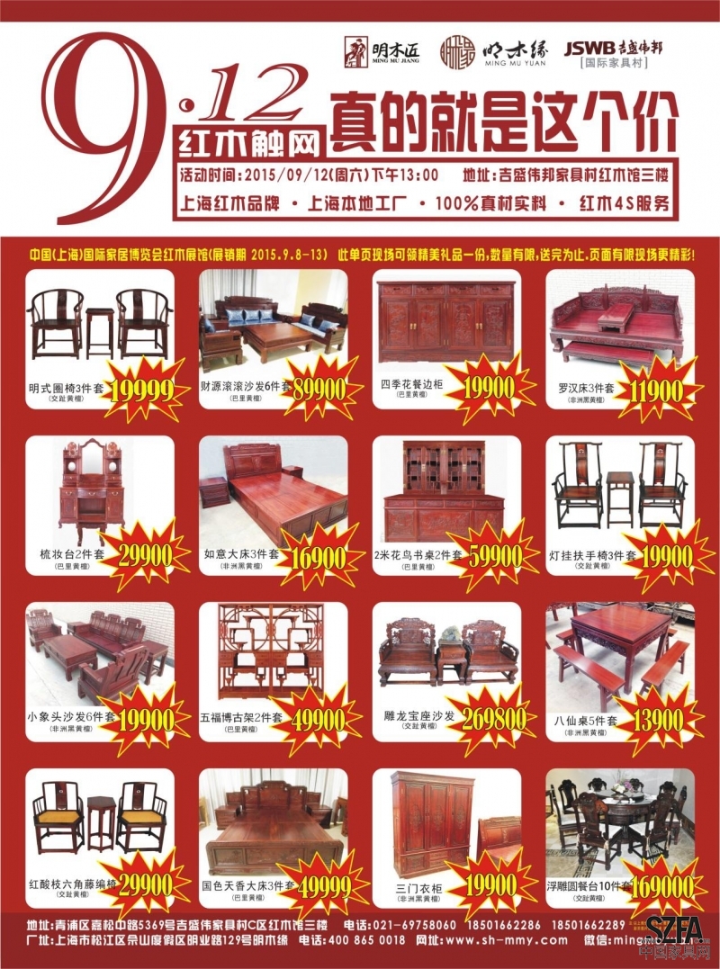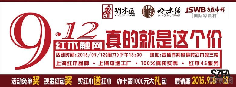 為推廣紅木首次觸網(wǎng),明木緣將攜手兄弟品牌于9月8日——9月13日國際家具展期間,在紅木分會場嘉松中路5369號吉盛偉邦家具村舉行紅木觸網(wǎng)冰點(diǎn)價(jià),觸及行業(yè)價(jià)格底線,12號下午活動(dòng)當(dāng)天到場的嘉賓有驚喜禮品相送,現(xiàn)場設(shè)有千元大禮包、現(xiàn)金紅包,更有免單大獎(jiǎng)等您來拿。