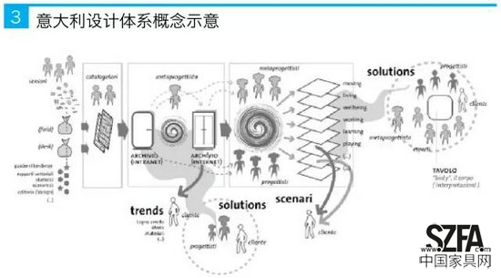德國的短板恰恰是意大利家具產(chǎn)業(yè)體系的優(yōu)勢所在,那就是整個產(chǎn)業(yè)生態(tài)都是按照設計驅動來建立的,依靠的是以中小型企業(yè)為主體的產(chǎn)業(yè)集群。意大利設計從潮流的研究、場景的構筑,到概念設計,以及最終的解決方案,能夠始終給消費者帶來不一樣的驚喜感覺,并引領著全球設計的走向,見圖3所示。