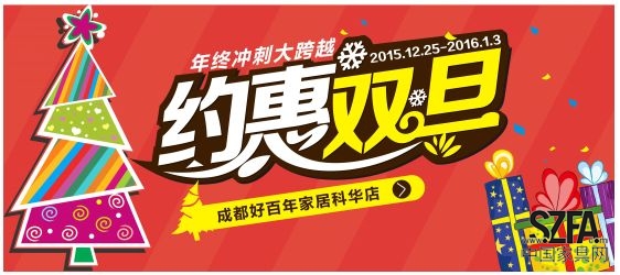 2015年已進(jìn)入尾聲,成都好百年家居廣場(chǎng)在廣大消費(fèi)者的大力支持下,即將步入嶄新的一年。“約惠雙旦,年終沖刺大跨越”是好百年家居廣場(chǎng)年終辭舊迎新的一場(chǎng)大型感恩回饋活動(dòng),為此,全場(chǎng)商家都在此次雙旦活動(dòng)上拿出折扣力度最大的優(yōu)惠參與此次鉅惠活動(dòng)。