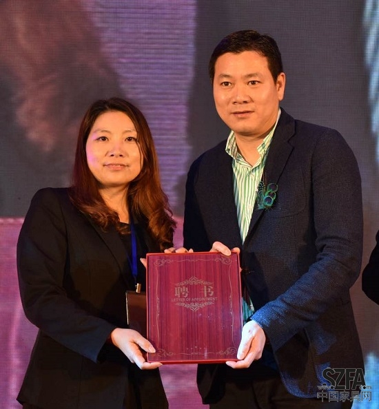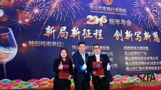 佛山市家具行業(yè)協(xié)會(huì)理事長左建華為佛山市家具行業(yè)協(xié)會(huì)新任秘書長文峰秘書長和康麗華副秘書長頒牌