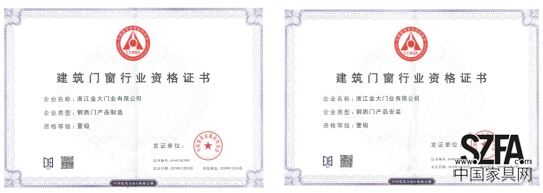 核心提示:日前,金大門業(yè)順利通過資質(zhì)審核,獲得建筑鋼質(zhì)門行業(yè)制造企業(yè)一級(jí)資質(zhì)、安裝企業(yè)一級(jí)資質(zhì)。據(jù)悉,金大門業(yè)也是國(guó)內(nèi)首批取得建筑