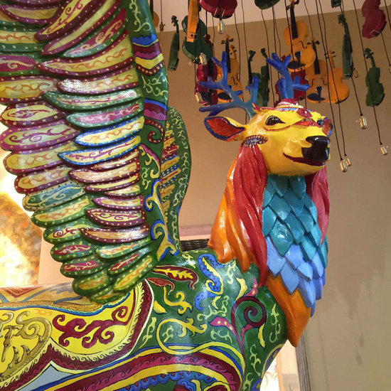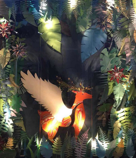 從JESSICA外面的通道走來(lái),藍(lán)色的金屬漆精致考究,宏奇壯麗的4個(gè)巨大櫥窗氣場(chǎng)強(qiáng)大。左側(cè)三個(gè)櫥窗內(nèi),茂密的叢林中靈鹿悠閑自在;右側(cè)弧形櫥窗內(nèi),螺旋的提琴吊燈下方,兩只展翅欲飛、身繪精美圖案的巨形彩鹿雕塑,簡(jiǎn)直亮瞎一路眾人的眼。