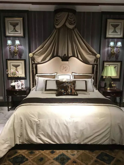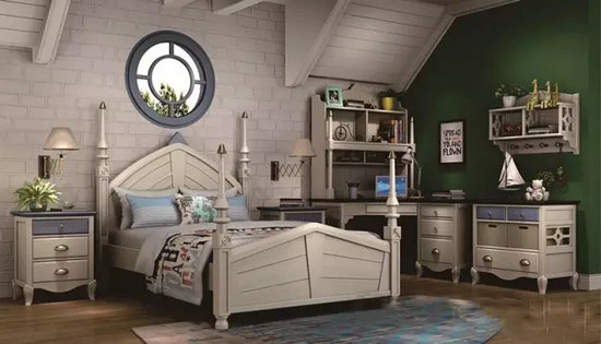 家具的表面經(jīng)過浮雕工藝處理,自然的木紋在白色油漆的襯托下,顯得高貴典雅。流暢的曲線與麻花柱相結(jié)合使整個空間不會顯得呆板,給人以愉悅的心情。床頭采用方柱與拱形結(jié)合 像似城堡的拱門有著守護(hù)與貴族的象征。