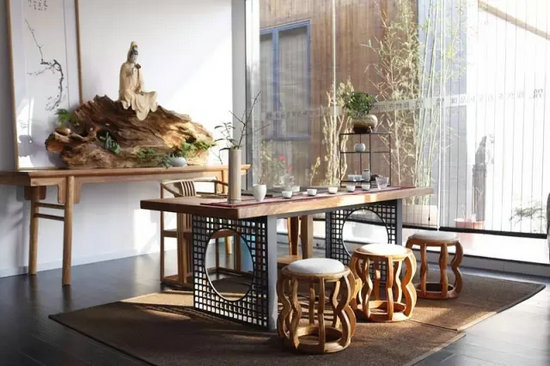 怡然茶室將園林中的透窗抽象提煉,運(yùn)用在茶桌的腿部設(shè)計之中,桌面鑲嵌烏金石茶盤,可直接漏水。整組產(chǎn)品注重人機(jī)工程學(xué),使用舒適。