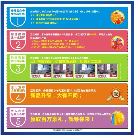 多喜愛青少年兒童家具始終堅持原創(chuàng)設計,更多的體現(xiàn)"個性"與"時尚",是站在時尚前沿的青少年的至愛。在滿足使用功能的基礎上,更以媲美藝術品的線條和造型,啟發(fā)與培育孩子的美感與創(chuàng)造力。2016新品升級,多喜愛青少年兒童家具新品發(fā)布邀您共賞,大有不同!同時,即日起預交20元即可搶購多喜愛《童心卡》 1張,縱享3重特權:贈送野餐防潮墊一個;超低專享價799元搶購價值1999元兒童床墊;獲得 300元增值補貼!還有超值換購,比半價還劃算!周末抽大獎,勁爆套餐……五一還有比這更實在的嗎?