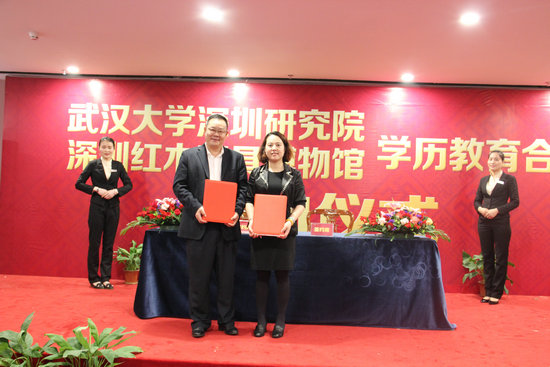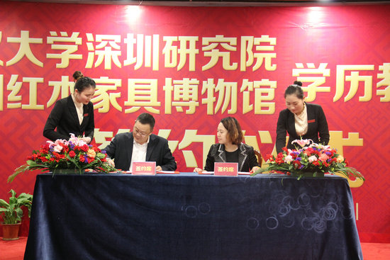 簽約現(xiàn)場(左:武漢大學(xué)深圳研究院院長助理熊萬能教授,右:深圳紅木家具博物館館長王溫漫女士)