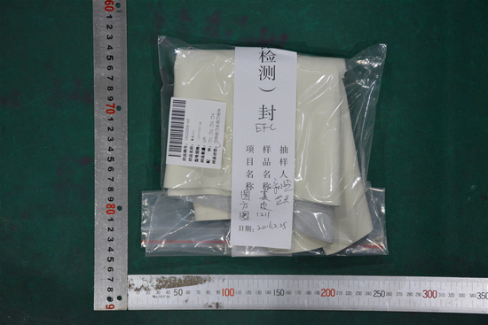 ⑥紡織品2183:數(shù)量2塊,在10卷抽樣基數(shù)上抽取,型號(hào)規(guī)格300×300(mm),生產(chǎn)日期/批號(hào)151222。