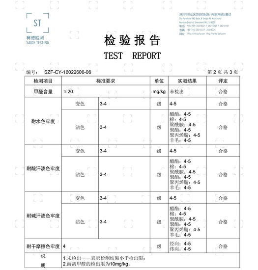 2016年2月,繼1月軟床成品抽檢之后,圓方園迎來賽德檢測對其關(guān)鍵原材料的品質(zhì)抽檢,此次共抽樣5款皮革面料、2款紡織品面料,針對理化性能及環(huán)保性能進(jìn)行全面檢測,抽檢結(jié)果“符合”優(yōu)品標(biāo)準(zhǔn)要求。
