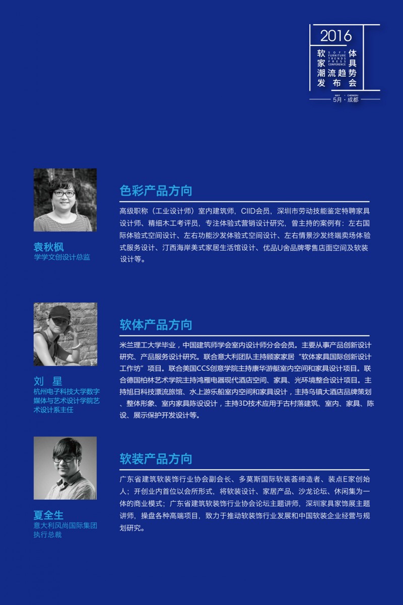 5月17日,2016軟體家具潮流趨勢發(fā)布會將在中國成都西部國際家具材料采購中心華麗啟幕,邀請三位由全球設(shè)計之都——米蘭歸來的重量級設(shè)計界嘉賓,分別從色彩趨勢、產(chǎn)品研發(fā)、軟裝配飾三個角度闡述國際潮流風(fēng)向。