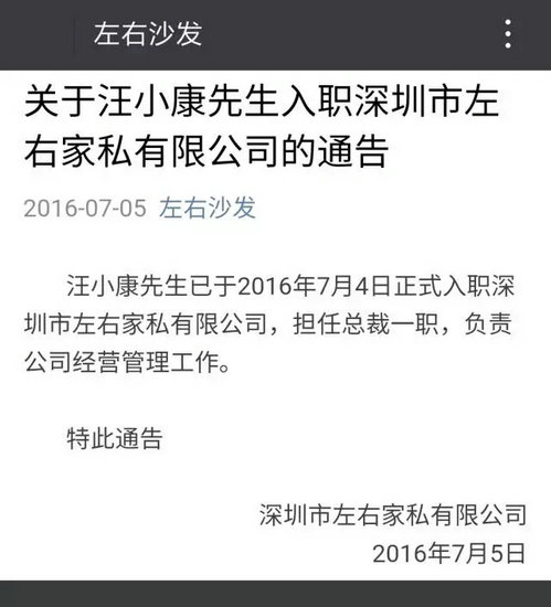 2016年7月4日,左右家私迎來(lái)一位新的總裁——汪小康,負(fù)責(zé)公司經(jīng)營(yíng)管理工作。