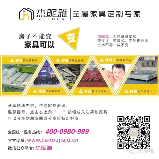 “杰昵雅”英文“Joiner”是工匠的意思,簡(jiǎn)歐家具用工匠制度培養(yǎng)工匠習(xí)慣,把工匠習(xí)慣升華為工匠精神,如此,方能成就“全屋家具定制專家”。