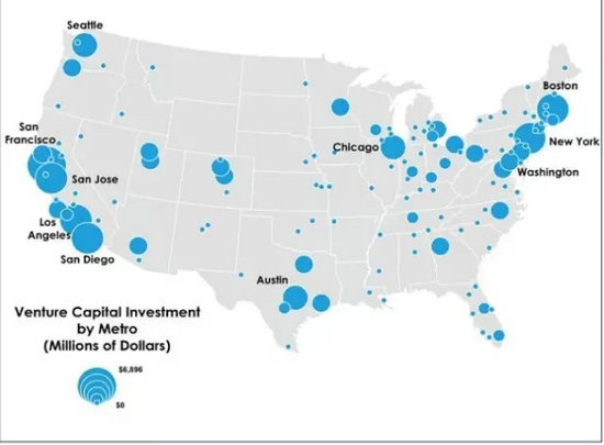 看數(shù)據(jù)。這是美國的風險投資分布圖,硅谷所占的整體比例低于30%,甚至30%都有很多水份,為什么?美國現(xiàn)在很多創(chuàng)業(yè)者不希望住硅谷,因為沒車的時候,困難死了,他們很多人希望下樓就吃有的,周圍還有創(chuàng)業(yè)者,時不時能聚會,但這在硅谷都做不到。所以大家都遷到城市,舊金山、洛杉磯、圣地亞哥、華盛頓、紐約、波士頓、芝加哥、西雅圖等等,這是第一個特點,城市化。