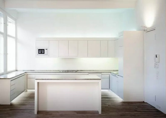 采用多白光組合(3,400-5,700K)分分鐘讓開放式廚房過度到起居環(huán)境。早晨,明亮?xí)晨斓睦浒渍彰鞑季钟诓僮髋_(tái);下午,光線變暗變暖直至晚上它呈現(xiàn)出讓人慵懶的暖白色,過渡連續(xù)結(jié)合遠(yuǎn)程操控。 另外,RGB彩色燈的加入讓室內(nèi)裝飾錦上添花。