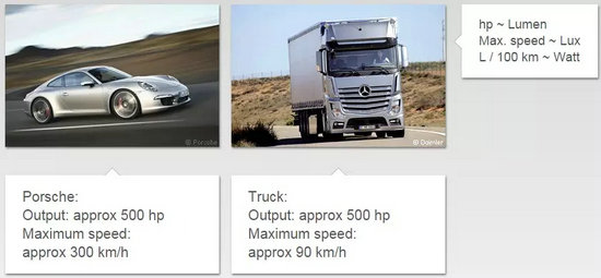 這就好像保時(shí)捷中國(guó)和卡車的最大速度是不同的,原因是車重不一樣。對(duì)于燈具而言,我們通常會(huì)給它們?cè)黾油哥R,透鏡可以聚集或者發(fā)散光線,照度值因此而增大或者減弱,這就是為什么相同的光通量的燈具可以產(chǎn)生不同的照度值的原因。