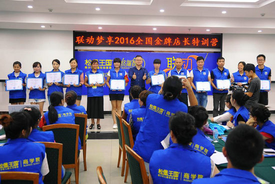 松堡王國銷售總監(jiān)汪克勝為學(xué)員頒發(fā)畢業(yè)證并合影