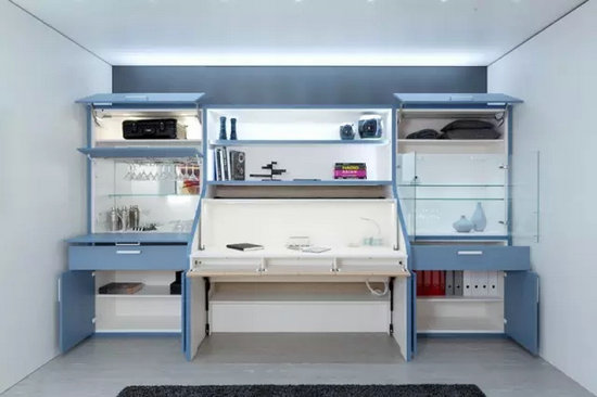 工作臺與臥床無縫切換的設(shè)計可謂技驚四座,沉穩(wěn)工作的氣氛一秒切換成休閑娛樂的場所,將空間的簡約利用發(fā)揮到極致。