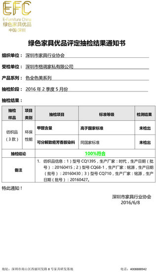 深圳市格調(diào)家私有限公司色全色美系列,一直是國內(nèi)布藝沙發(fā)市場的領(lǐng)導(dǎo)品牌,其豐富絢麗的布藝色彩、獨(dú)特的現(xiàn)代風(fēng)格、完美的工藝制作、華麗的視覺感受,廣為消費(fèi)者所喜愛。5月份針對格調(diào)家私主要抽樣3款不同品牌的紡織品進(jìn)行檢測,甲醛和可分解致癌芳香胺染料經(jīng)抽檢結(jié)果顯示“未檢出”,環(huán)保性能優(yōu)異。